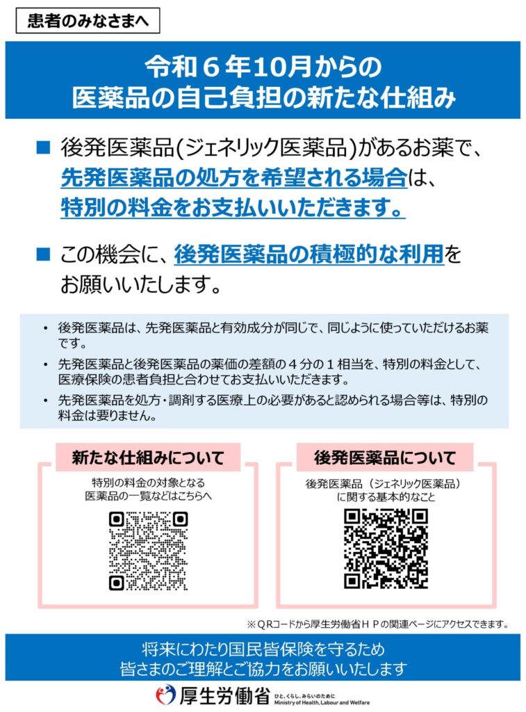 令和6年10月からの医薬品の自己負担の新たな仕組みとして、後発医薬品(ジェネリック医薬品)があるお薬で、先発医薬品の処方を希望される場合は、特別な料金をお支払いいただく仕組みが始まります。