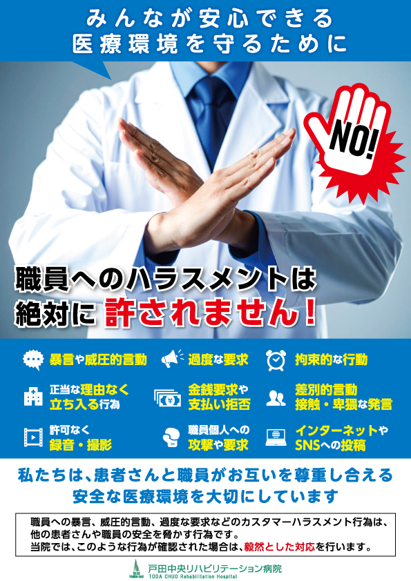 当院は患者さんと医療従事者が相互に尊重し、信頼しあえる安全な医療環境を提供することを最優先としています。そのためには、当院のすべての職員が安心して業務に従事する環境を整えることも重要と考えております。